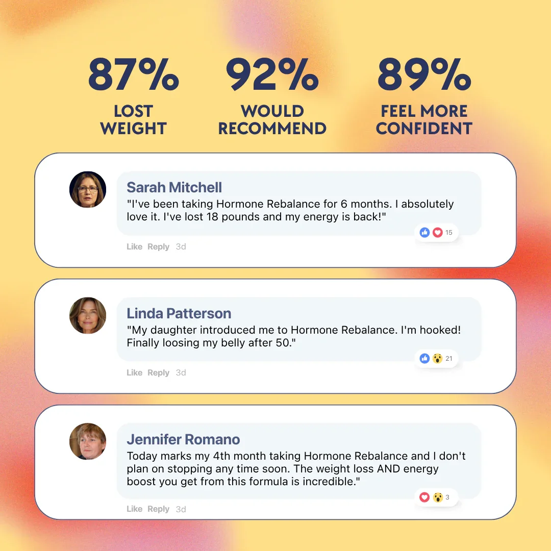 "I was shocked when the scale kept climbing despite my strict diet and exercise routine. My doctor said it was ‘just aging,’ but I knew something was off. Within a month of taking Hormone Rebalance, my cravings disappeared and I’ve been able to maintain a healthy weight effortlessly."